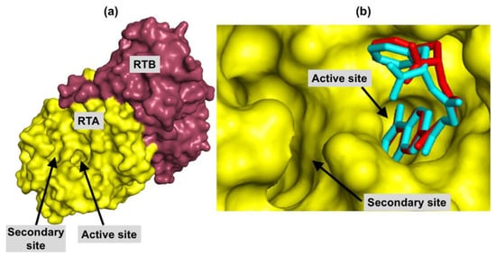 (a) localization of RTA active and secondary sites with respect to ricin complete structure. RTA surface is in yellow and RTB surface is in pink (PDB code: 3RTI); (b) best ranked pose, in red, and experimental position, in cyan of NNPCP inside RTA, whose surface is yellow. All ligand hydrogens are hidden for better clarity.