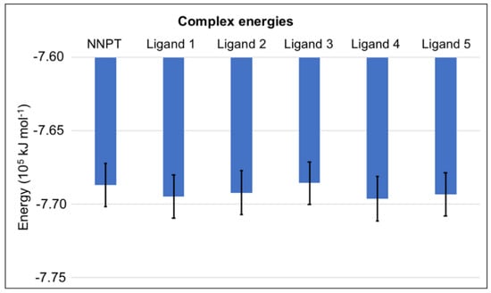 Plots of total and mean energy of each protein-ligand complex over time (Figure S2) point to complex stabilization of all studied systems at the beginning of the MD simulation. Figure 4 shows a bar chart containing mean and standard deviation values of the complex energies. The low standard deviations and the similarity to the energy of the complex RTA/NNPT confirm stabilities of the complexes.