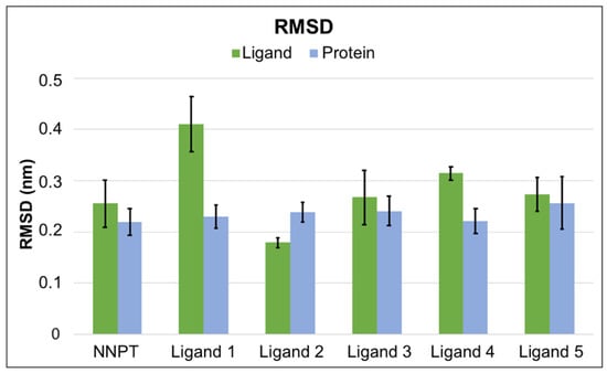 RMSD values were also analyzed to verify the stability of protein and ligand in each complex. A bar chart showing the mean and standard deviation of the RMSD values between 20 ns and 50 ns of simulation is shown in Figure 5.
