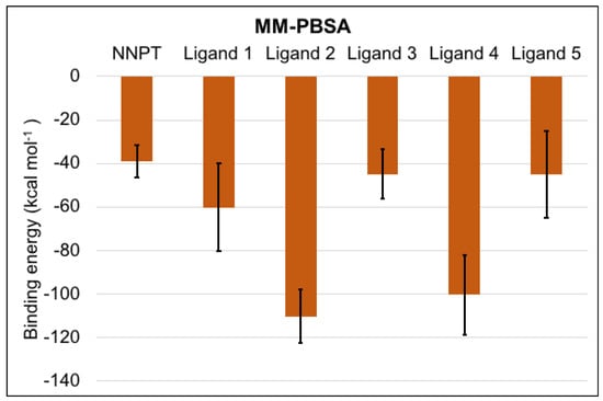 The values of mean and standard deviation of the binding energy between RTA and each ligand obtained through MM-PBSA calculations (Figure 7) are aligned with the previous docking and MD simulation results, since all ligands behave better than NNPT, showing more negative binding energies. Ligands 2 and 4 had the best results in terms of MM-PBSA binding energy, once again suggesting that these molecules are likely to be good hits in the discovery of RTA competitive inhibitors.