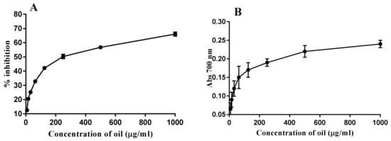As described in Figure 1, the results showed a radical scavenging activity of the PGO, which was determined as 32.8, 42.2, 50.3, 56.7, and 66% with different concentrations 62.5, 125, 250, 500, and 1000 µg/mL PGO, respectively, while the reducing power activity was determined within the applied concentrations (7.8, 15.6, 31.2, 62.5, 125, 250, 500, 1000 µg/mL). A significant difference (p < 0.05) among reducing activities observed at different concentrations (0–1000 µg/mL PGO). The highest reducing power was recorded at 1000 µg/mL of oil concentration (Figure 1). The antioxidant potency illustrates how polyphenols enhanced the efficacy against the free radicals and carcinogenic materials. The reducing capacity of the PGO recorded increasing by the concentration increases (0–1000 µg/mL); this relation is supported by a previous study []. It is worth mentioning that there are no published data on PGO reducing power efficacy.