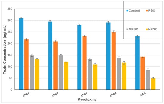 Based on the fact that plant extracts (polar or non-polar) possessed bioactive molecules in various amounts, which previously were reported by a capability to reduce mycotoxin excretion [,]. The obtained results will be discussed in this section to prove the synergized impact of PGO oleoresin in minimizing the mycotoxin formation. The minimizing action encouraged using the PGO, which occurred by the insertion of PGO in the fungal growth of liquid media. The mycotoxin decreases compared to the control reflect how the PGO components were synergized. This change in the condition of the growth media did not encourage mycotoxin secretion. The AFs are groups of health-hazard compounds, and also are classified as polyketide-derived []. Their production relies on more than twenty genes clustered together in the DNA-sequence region. The genes encode a plurality of enzymes participatory in toxin synthesis as transcription agents []. A nearer strategy of synthesis process was reported for the ZEA toxins, where it is also having a lacto-coumarin ring connected to their toxicity. Subsequently, the synthesis of enzymes related to these genes could be affected by the existence of PGO active molecules.