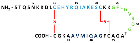Amino acid skeleton of the mature heat-stable enterotoxin b (STb) toxin. The toxin is comprised of 48 amino acid residues, starting at the N-terminal. Disulfide bridges are shown in red. The integrity of the disulfide bond at Cys 21 and Cys 36 is necessary for the toxigenic region to be active. Light blue residues 10–21: amphipathic alpha-helix portion; residues 18–30: receptor binding/toxigenic region; green residues 24–31: tight junction manipulation region; residues 37–42: oligomerization region; dark blue residues 38–44: hydrophobic alpha-helix region [12,13].