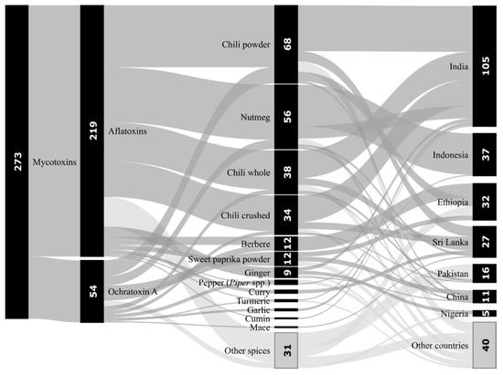 Aflatoxin B1. Number of AFB1-positive studies has been proven as very high in ginger, chili, and turmeric; as high in black pepper, cumin, coriander, and cinnamon; and as moderate in fennel, caraway, thyme, and nutmeg—see Table S1 of the Supplementary Materials.