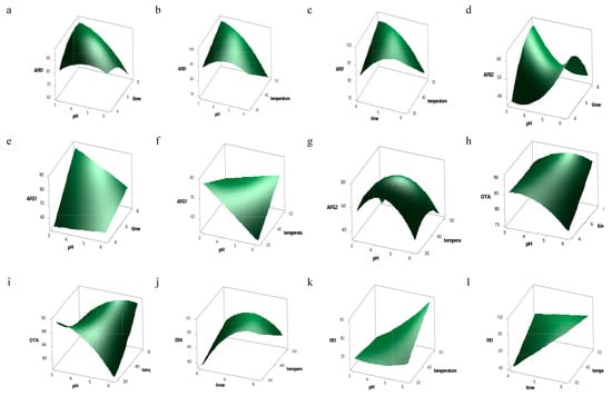 Response surface plots showing the interaction effect of independent variables on the reduction of 8 mycotoxins (a–c) AFB1, (d) AFB2, (e–f) AFG1, (g) AFG2, (h–i) OTA), (j) ZEA), (k–l) FB1, (m) FB2.