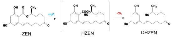 Mechanism of zearalenone (ZEN) degraded into hydrolyzed zearalenone (HZEN) and decarboxylated hydrolyzed zearalenone (DHZEN) by lactonohydrolase ZHD101 (Adapted from [25]).