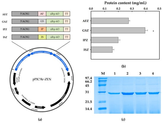 The schematic diagram of the four recombinants and the comparison of secretion expression levels of ZLHY-6. (a) Schematic diagram of the four constructed recombinant plasmids containing three copies of zlhy-6O expression cassettes led by an individual signal peptide. (b) The comparison of the secretion yields of ZLHY-6 induced by four different signal peptides. Each result represents the mean ± SD with three replicates per experiment. Significant differences are indicated with * (p < 0.05). (c) SDS-PAGE analysis of the four recombinants induced by different signal peptides. Lane M: protein ladder; lanes 1–4, fermented supernatants from recombinant Pichia pastoris with 96 h induction by AFZ, GSZ, IPZ, and ISZ, respectively.