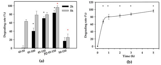 ZEN degradation in corn oil under different treatments. (a) Corn oil treated for 2 and 5 h by 50 mg/kg ZLHY-6 at 45 °C, 100 mg/kg ZLHY-6 at 45 °C, 150 mg/kg ZLHY-6 at 45 °C, 150 mg/kg ZLHY-6 at 45 °C with 1 min of pre-homogenization, 150 mg/kg ZLHY-6 at 50 °C with 100 rpm gentle vortex, respectively. (b) Pattern of 0–5 h ZEN degradation with 150 mg/kg ZLHY-6 and gentle vortex after 1 min of pre-homogenization in 3 L bioreactor. Each result represents the mean ± SD with three replicates per experiment. Significant differences are indicated with * (p < 0.05).