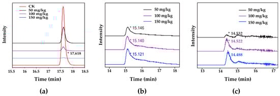 The ion chromatograms for intensity of ZEN and the degradation products (HZEN, DHZEN) in corn oil detoxified with different concentrations (50–150 mg/kg) of degrading enzyme. (a) ZEN. “CK” means the neutralized oil treated with the same amount of water without enzyme. (b) HZEN. (c) DHZEN.