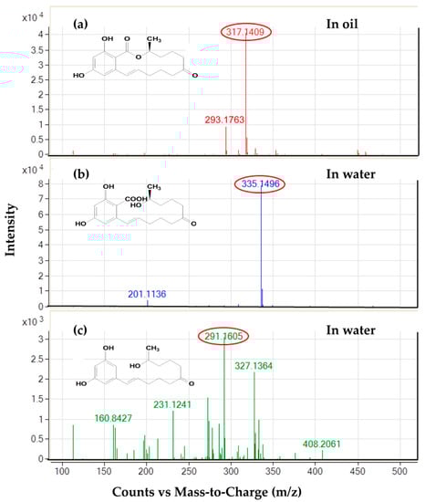 To examine the distribution of degradation products, the base signals at m/z 335, 291, and 317 amu under full scan measurements (enhanced mass scan, EMS mode) were presented for ZEN and its two chromatographically thoroughly separated products, respectively. The outcomes were consistent with the deprotonated molecular ions [M-H]− for the structures of the three compounds mentioned above. According to the electrospray ionization (ESI) spectrum in negative ion mode, the deprotonated molecular ion [M-H]− of apolar ZEN at m/z 317 amu existed only in the oil layer, as expected (Figure 5a). On the other hand, the signals for polar HZEN and DHZEN at m/z 335 and 291 amu, separately, were detected in the water layer extraction, which were removed by centrifugation at 4000 rpm for 10 min after enzymatic hydrolysis (Figure 5b,c).