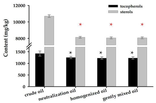 The analysis of tocopherol and sterols contents in corn oil with different experiments. Each result represents the mean ± SD with three replicates per experiment. The black * concerns the comparison on tocopherols in crude oil, and the red * concerns the comparison on sterols (p < 0.05).