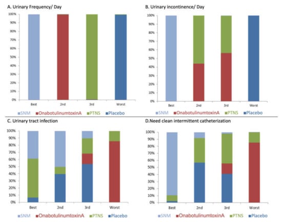 - Niu, H.L.; Ma, Y.H.; Zhang, C.J. Comparison of OnabotulinumtoxinA versus sacral neuromodulation for refractory urinary urge incontinence: A systematic review and meta-analysis of randomized controlled trials. Int. J. Surg. 2018, 60, 141–148. [Google Scholar] [CrossRef] [PubMed]