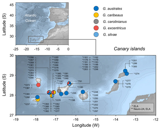 Micro-algal culture isolates of Gambierdiscus spp. (n = 67) used in the analysis belong to the Culture Collection of Harmful Microalgae of the Spanish Institute of Oceanography (CCVIEO). Sixty-three strains were sourced from seven different locations in the Canary Islands. However, since there was only one strain of G. carolinianus from the Canary Islands, four additional strains from Cuba were added to the analysis, VGO1397, CUB-9B5, CUB-9C6 and CUB-9C8, all of them were analysed by ELA and the VGO1397 strain was also analysed by Neuro-2A.