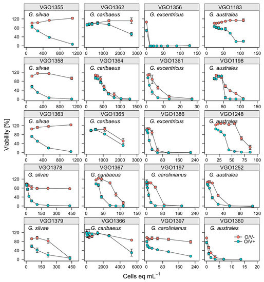 Neuro-2a cells, exposed to G. excentricus extracts (VGO1356, VGO1361, VGO1386) at concentrations ranging between 10.5 and 54 microalgal cells eq mL−1 with O/V−, showed a very low viability (<20%). The activity of G. australes extracts presented higher variability in toxicity responses as compared to G. excentricus. Four extracts (VGO1198, VGO1248, VGO1252, VGO1360), at concentrations ranging between 80 and 100 cells mL−1 in O/V−conditions, affected the cell viability highly. However extract (VGO1183) at the same concentrations and conditions did not affect the cell viability. This variability in O/V− conditions could be observed also in G. caribaeus and G. silvae extracts. For G. caribaeus, 3 out of 5 strains affected Neuro-2a viability at levels ranging from 70 to 1000 cells eq mL−1 (VGO1364, VGO1365, VGO1367). For G. silvae, 1 out of 4 strains (VGO1379) affected Neuro-2a viability at approximately 500 cells eq mL−1 (Figure 2). For the other strains of G. caribaeus (VGO1366) and G. silvae (VGO1358), no signals of toxicity under O/V− conditions appeared at 3000 cells eq mL−1 and 1000 cells eq mL−1, respectively (Figure 2).