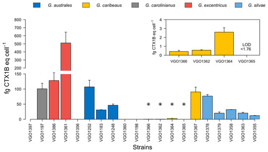CTX-like toxicity expressed in femtograms of CTX1B equivalents per cells (fg CTX1B eq cell−1) of Gambierdiscus strains as determined in a Neuro-2a cytotoxicity assay. Strains with the lowest concentrations are indicated by asterisks (*) and shown in the small bar plot in the inset. Strains VGO1397 (G. carolininanus), VGO1356 (G. excentricus), VGO1360 and VGO1198 (G. australes) could not be quantified. Bars in the columns represent the standard deviation.