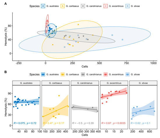 Scatter plot (A) and line regression (B) of the relationship between cell abundance and haemolysis (%) for each Gambierdiscus strain. Ellipses and shaded areas in panels A and B represent the 95% confidence intervals. Correlation coefficients (R) and p-values are indicated in each line regression plot.