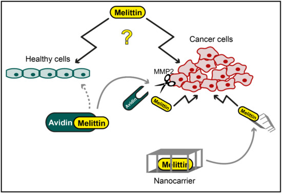 Potential application of melittin in cancer therapy. While specific cytotoxic effects of melittin against cancer cells have been reported, melittin has also been shown to mediate unspecific toxicity towards healthy cells (illustrated as question mark). However, chemical modification, e.g., by conjugation of melittin to avidin, which is cleaved and activated by cancer cell-specific matrix metalloproteinase 2 (MMP2), or cancer cell-directed targeting of melittin with nanocarriers might be used to overcome this unspecific toxicity.