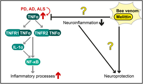 Postulated therapeutic effects of bee venom and melittin against neuroinflammation in diverse neurodegenerative diseases. The tumour necrosis factor α (TNF-α) pathway (illustrated in a simplified way) is an important mechanism by which inflammatory processes are activated and is overstimulated in various neurodegenerative disorders (red arrows), including Parkinson’s disease (PD), Alzheimer’s disease (AD) and amyotrophic lateral sclerosis (ALS). The protective effects of bee venom and melittin (shown with black arrows for activation and black bar-headed arrows for repression) are controversial (illustrated as question marks in the figure). Further research is required to characterize these effects and to evaluate, whether they are caused by a reduction in neuroinflammation or by other mechanisms. TNFR1/2 = Tumour necrosis factor receptor 1/2; IL-1α = Interleukin 1α; NF-κB = Nuclear factor kappa-light chain enhancer of activated B cells.