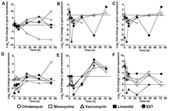 We used a two-compartment hollow fiber in vitro pharmacokinetic/pharmacodynamics (PK/PD) infection model to study the effect of antimicrobials on expression of select S. aureus virulence genes in a simulated human pharmacokinetics condition. FiberCell hollow fiber C2011 cartridges were obtained from FiberCell Systems Inc. (New Market, MD, USA). This two-compartment capillary system infection model is used to study the effect of simulated pharmacodynamic concentrations of antimicrobials on human bacterial or viral pathogens. This system optimizes drug delivery and allows for simulation of sequestered infections []. A single model provides duplicate assessment of antibiotic treatment with sample collection taken from two separate ports of the hollow fiber chamber. Prior to initiating the model, the hollow fiber model was conditioned in THB medium overnight. The inoculum for each model was standardized by injecting 0.2 mL of a 0.5 McFarland bacterial suspension into the 20 mL extra capillary space of the model for a starting inoculum of 1 × 106 colony forming units per mL (CFU/mL). The antimicrobials were administered via bolus infusion after 30 min into the central reservoir of 300 mL to target the free maximum concentration in humans. The unbound free (f) antibiotic concentrations were maintained according to the recommended doses and pharmacokinetics for Cmax and half-life estimates in humans published elsewhere: clindamycin 600 mg every 8 h [], linezolid 600 mg every 12 h [], minocycline 100 mg every 12 h [], SXT—trimethoprim 160 mg/sulfamethoxazole 800 mg—every 12 h [], and vancomycin 1000 mg every 12 h []. The antibiotic regimens were simulated to target pharmacokinetic parameters of Cmax, AUC, and Cmin and have been previously described []. Human pharmacokinetic antibiotic profiles were achieved by adding and eliminating growth medium into the central reservoir to maintain the antibiotic elimination half-life. This model was run in a single replicate with two samples taken for each time point for analysis.