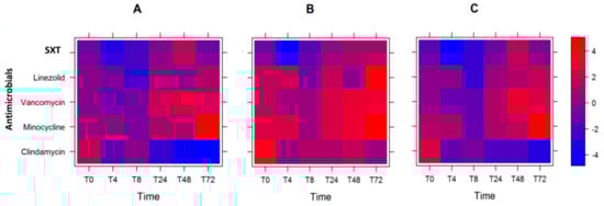 However, when we changed the weight assignments, and lukSF-PV was not weighted as the most significant gene (Table 2, weight = 0.0 (for lukSF-PV), 0.5, 0.33, 0.17), we observed that the optimum course of antibiotics changed. Here, SXT was the optimum antibiotic from T0 to T24, then linezolid at T48, and clindamycin at T72 for reducing gene expression (Table 2 and Figure 2B). Furthermore, when all the virulence genes were given equal weight (0.25, 0.25, 0.25, 0.25), SXT remained the preferred antibiotic at T0 and T4, followed by linezolid at T8, and clindamycin at T24–T72 (Figure 2C and Table 2). In two of the three scenarios, order of effectiveness of all antibiotics remained the same: SXT, followed by linezolid, and then clindamycin. In addition, we note that the overall log2 fold-change of the weighted gene expression levels were increased for all antibiotics, and at most time-points, when lukSF-PV was unweighted and sel and sek genes were given the highest weight (intense red color; Figure 2B) compared to when lukSF-PV was weighted highest (Figure 2A) or all genes were weighted equally (Figure 2C). One explanation for this observation is that the reduction of lukSF-PV expression is very important to overall reduction of the virulence gene expression levels, which could contribute to the selection of antibiotic use for the USA300 strain.