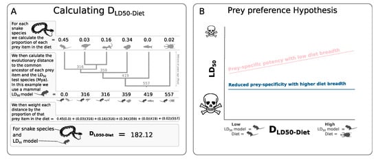 Like an ecological community, a predator’s diet can be diverse in numerous ways. For example, while the diet of the Western diamondback rattlesnake (Crotalus atrox) is species rich, much of its diet is comprised of rodent species []. In contrast, while the diet of a King brown snake (Pseudechis australis) may have a similar species richness to that of the Western diamondback rattlesnake, the diversity of its prey ranges from taxonomically disparate groups including amphibians, mammals, birds and invertebrates []. From an evolutionary perspective, the venom of a snake with a phylogenetically restricted diet is unlikely to experience the same selection pressures compared to a venom that is required to incapacitate prey from various different taxonomic groups. Here we use various measures of diet diversity, including species richness, taxonomic richness and phylogenetic diversity [], to test the role of diet breadth in mediating the prey-specific nature of venom potency in snakes. We predict that snake species with taxonomically or phylogenetically narrow diets will have venom potencies displaying the strongest prey-specific effects (Figure 1). Prey-specific venoms are expected to show decreasing potencies, with increasing evolutionary distances between potency-model species and natural prey species (DLD50-Diet) []. Hence, we hypothesise that diet breadth will interact negatively with DLD50-Diet, so that species with narrow diets show stronger prey-specific potencies when compared to species with more generalist diets.