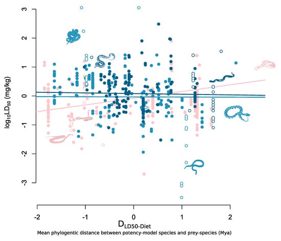 Our findings show that while venom potency is prey-specific, this prey specificity is mediated by the breadth of the snake’s diet, with snakes with taxonomically diverse diets having less prey-specific venom potencies. In snakes with taxonomically narrow diets, venom potencies were found to decrease with larger evolutionary distances between potency-model species and natural prey species (DLD50-Diet). This prey-specific pattern follows the expected pattern that venoms are selected to have the highest functional efficacy against common targets, such as seen in several predator–prey cases studies, prey switching experiments [,,,,], and comparative analysis []. However, we find that this prey-specific relationship is lost in species with more than one taxonomic class of prey in their diets, as indicated by a negative interaction between diet breadth and DLD50-Diet. These results support the prey preference hypothesis [], where the venoms of species with taxonomically diverse prey are selected to have less prey-specific potencies in comparison to specialist feeders. This difference in the levels of prey specificity of venom is expected as, while the venoms of more specialist feeders, such as King cobras (Ophiophagus hannah), are likely to be selected to incapacitate a relatively narrow range of physiologies, the venoms of generalist feeders are likely to be selected to have the ability to incapacitate a larger diversity of physiologies, such as the case in King brown snakes (Pseudechis australis), which prey on species ranging from invertebrates to mammals [].