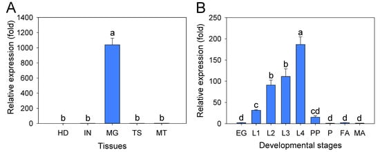 qPCR expression profile of the P. xylostella PxTryp_SPc1 gene in different tissues and developmental stages. (A) Relative expression levels of PxTryp_SPc1 in different tissues including head (HD), integument (IN), midgut (MG), testis (TS), and Malpighian tubules (MT) of fourth-instar larvae. (B) Expression profile of PxTryp_SPc1 in different developmental stages: eggs (EG), first-instar larvae (L1), second-instar larvae (L2), third-instar larvae (L3), fourth-instar larvae (L4), prepupae (PP), pupae (P), male adults (MA), and female adults (FA). RPL32 gene expression was used as the internal reference gene to normalize and calculate the gene expression levels. Expression level was calculated according to the value of the lowest expression identified (Tissues: HD; developmental stages: P), which was given an arbitrary value of 1. The means and the corresponding standard errors are shown. Different letters stand for statistically significant differences within the three replicates and four technical repeats (p < 0.05; Duncan’s test; n = 3).