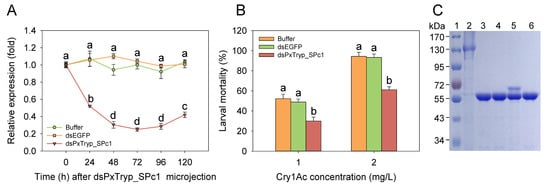 Influences on Cry1Ac toxicity of PxTryp_SPc1 expression in larval midgut after RNAi silencing. (A) Impacts on injection of larvae with buffer, dsEGFP, or dsPxTryp_SPc1 on PxTryp_SPc1 expression after 120 h RNAi silencing from P. xylostella. Different letters represent statistically significant differences within three repeats and four technical replications (p < 0.05; Duncan’s test, n = 3). (B) Mortality of P. xylostella larvae after treatment with two concentrations of Cry1Ac protoxin; larvae were injected with buffer, dsEGFP, or dsPxTryp_SPc1. Within each group, different letters denote statistically significant differences between treatments (p < 0.05; Duncan’s test, n = 3). (C) Activation analysis of Cry1Ac protoxin by P. xylostella midgut extracts from larvae injected with: dsEGFP (lane 4), dsPxTryp_SPc1 (lane 5), and buffer only (lane 6). Lane1: protein maker; Lane 2: Cry1Ac protoxin; Lane 3: Cry1Ac incubated with bovine trypsin (positive control).