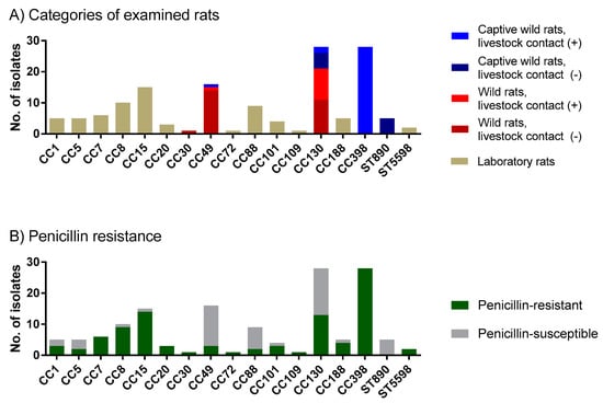 We have previously reported that murine S. aureus isolates show a lower prevalence of penicillin resistance than human strains [34]. To extend these findings, we determined the MIC of penicillin for all rat-derived S. aureus isolates using the broth microdilution method. Overall, 95/144 (66.0%) isolates were penicillin-resistant, however the prevalence varied significantly between the groups (Chi-Squared test, p < 0.001). While the resistance rate was low in S. aureus isolates from free-living wild rats (15/37; 40.5%), it averaged 73.2% (30/41) in captive wild rats and 75.8% (50/66) in laboratory rats. The highest rate of penicillin resistance (96.3%; 26/27) was observed in rats with livestock contact (Table 1, Tables S6 and S7). This pattern is also reflected by varying rates of penicillin resistance in S. aureus lineages associated with either free-living wild rats (CC49, CC130), captive wild rats (CC130, ST890), laboratory rats (various CCs) and captive wild rats with previous livestock contact (CC398) (Figure 1A,B).