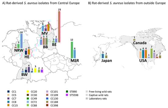 The S. aureus lineages CC49 and CC130 are widespread among wild rats, whereas CC8, CC15 and CC188 are widespread among laboratory rats. The graph illustrates the occurrence of S. aureus lineages (CC) in different federal states of Germany and the Czech Republic (A), as well as in Japan, Canada and the USA (B). For a definition of the different rat categories, please refer to the legend of Table 1. For captive wild rats, the location of the husbandry, rather than their capture location, is depicted. The different lineages are color coded; S. aureus isolates from free-living and captive wild rats are depicted in differentially-striped bars. S. aureus isolates from laboratory rats are shown in solid bars. The absolute number of isolates is depicted on top of the bars. Abbreviations: BB, Brandenburg; BE, Berlin; BW, Baden-Württemberg; HE, Hesse; MV, Mecklenburg-Western Pomerania; NRW, North Rhine-Westphalia; MSR, Moravian-Silesian Region.