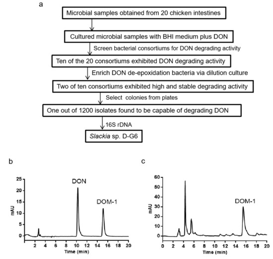 Screening procedure and HPLC analysis of DON and DOM-1 after co-culture of DON with D-G6. (a). Procedure for screening DON transforming bacterium. (b). HPLC chromatography of standard DON and DOM-1. (c). The products of DON transformed by D-G6. DON and DOM-1 standards are indicated at 10.1 min and 15.6 min, respectively.