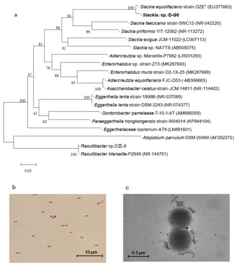 The phylogenetic tree and morphology of Slackia sp. D-G6. (a). The phylogenetic tree of D-G6 based on 16S rDNA genes. The GenBank accession numbers of the sequences are shown in parentheses. The bar indicates 0.01 substitutions per nucleotide position. (b). Gram staining of D-G6. (c). Microscopic images of D-G6 under TEM.