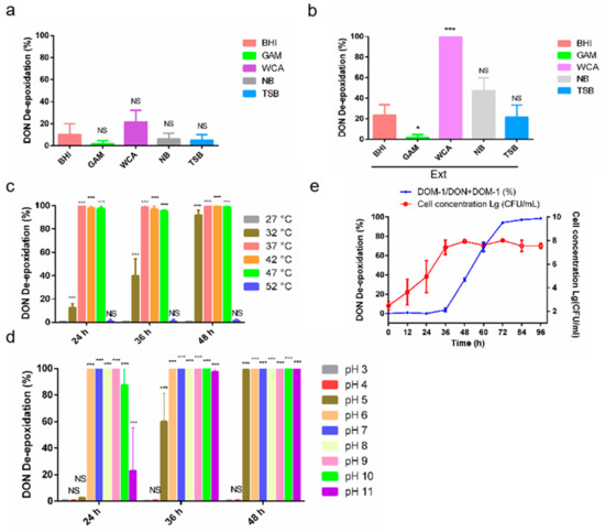 Metabolic characteristics of Slackia sp. D-G6. (a). Transforming efficiency under different media. (b). Transforming efficiency under different medias plus chicken intestine extracts (Ext). (c). The efficiency of DON de-epoxidation of D-G6 at different temperatures. The experiments were performed in WCA modified medium at pH 6.5. (d). The effects of varying pH on DON de-epoxidation. The experiments were performed in WCA modified medium and the temperature was set at 37 °C. (e). The growth curve and metabolic curve of D-G6 against time. Inoculation density was approximately 100 CFU/mL, the temperature was 37 °C, and pH was 6.5. All experiments were replicated three times biologically. The error bars represent the standard deviations. * indicate significantl difference (* P < 0.05, *** P < 0.001), “NS” means “no significance”.