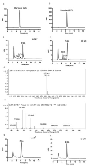 To verify the capability of D-G6 for transforming DZN, D-G6 was incubated with DZN at 37 °C under anaerobic conditions and the products were detected using HPLC and Q-TOF-MS. Both DZET and D-G6 converted DZN (5.2 min) to EQL (6.2 min) and DHD (4.2 min) following 2 d of incubation (Figure 4a–d). The 4.2 min product was verified using Q-TOF-MS (Figure 4e,f). When incubation time was prolonged to 3 d, both D-G6 and DZET completely transformed DZN into EQL (Figure 4g,h).