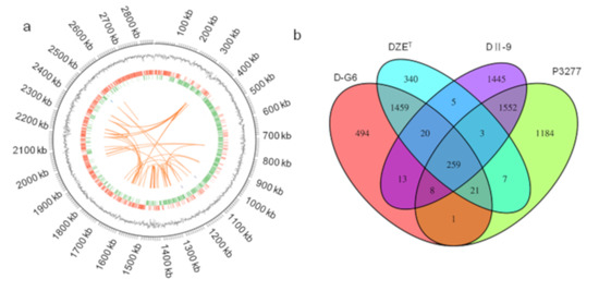 In order to understand molecular mechanisms underlying DON de-epoxidation, the genome of D-G6 was sequenced and compared to reference genomes of DZET. The genome of DG-6 is 2,863,556-bp long (Figure 5a), with G + C content of 60.48%, 2312 predicted protein coding genes, 29 rRNA genes, and 47 tRNA genes (Table 3).