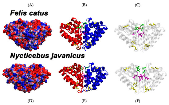 Molecular modelling comparison of Felis catus dander allergen Fel d1 (top, A–C) and Nycticebus javanicus brachial gland secretion protein (bottom, D–F). A and D show the electrostatic surface of both proteins. Positive charges are depicted in blue, negative charges in red. B and E show cartoon representations of the same proteins. Domain A is shown in red, Domain B in blue. C and F are identical to B and E, but with transparent tertiary structure. B, C, E, and F: disulfide bridges are highlighted in yellow. B and C: N89 and I125 of Domain A and N89 and D130 of Domain B form the Ca2+ binding site at the domain interface in F. catus. These four residues are shown in green with the Ca2+ ion in pink. Six amino acids forming the hydrophobic core at the interface of Domains A and B are coloured in magenta (F85, G131, and L132 in both Domains A and B, respectively) E and F: possible Ca2+ binding in N. javanicus involves T81 and T117 of Domain A and T81 and D123 of Domain B. The hydrophobic core may consist of G77, D123, and I124 in both Domains A and B. D123 as a charged amino acid is expected to affect the interface in N. javanicus.
