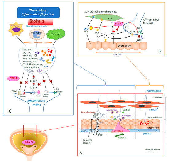 Inflammation-induced afferent sensitization to recruit immune cells is an important protective mechanism to resist infection in the urinary tract [44,45] (Figure 1, part C). However, prolonged inflammation may result in the long-lasting sensitization of afferents and lead to chronic pain [45]. Most experts believe that bladder pain can be attributed to chronic inflammation although the pathogenesis is still inconclusive due to contradictory histopathology results. However, an increase in proinflammatory mediators (histamine, NGF, and those released from mast cells) within the bladder and urine of IC/BPS patients has been widely reported, which is consistent with the hypothesis of inflammation causing bladder pain [46,47,48]. Cui et al. [49] were the first to describe the direct involvement of BTX-A in pain modulation after inhibiting inflammation. Formalin-induced edema and accompanying peripheral glutamate release were reduced by intraplantar BTX-A injection in rats.