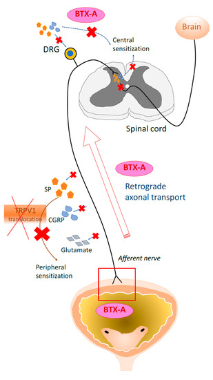 Illustration of Actions of BTX-A along the pain pathway. (1) BTX-A blocks the release of nociceptive neurotransmitters (SP, glutamate and CGRP) from afferent nerve endings and the translocation of TRPV receptor, leading to peripheral desensitization and results in attenuation of inflammation and pain. (2) Intravesical-injected BTX-A gains access to dorsal root ganglia (DRG) and spinal cord via retrograde axonal transport pathway. By blocking SP and CGRP there, BTX-A inhibits further central sensitization.