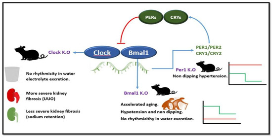Canonical clock genes and the basic regulatory loop: impact on the kidney of genetic defects. In the most basic regulatory loop, Clock and Bmal1 are transcription factors that promote Cry and Per gene expression, and Cry and Per proteins, in turn, suppress Clock/Bmal1 induction of their Cry and Per transcription. Genetic disruption of some canonical clock genes has yielded renal-hypertension phenotypes as illustrated above for Clock, Bmal1, and Per1 in mice. Clock KO mice display loss of water and electrolyte excretion rhythmicity as well as differential responses to induction of kidney fibrosis, which appears specific of the driver of fibrosis (worse unilateral ureteral obstruction (UUO)-induced fibrosis but milder sodium overload-induced fibrosis). Bmal1 KO mice display accelerated aging, loss of rhythmicity of water excretion as well as non-dipping hypotension (red line) as compared to the normal blood pressure circadian rhythm (green line). Per1 KO mice display non-dipping hypertension (red line) as compared to the normal blood pressure circadian rhythm (green line).