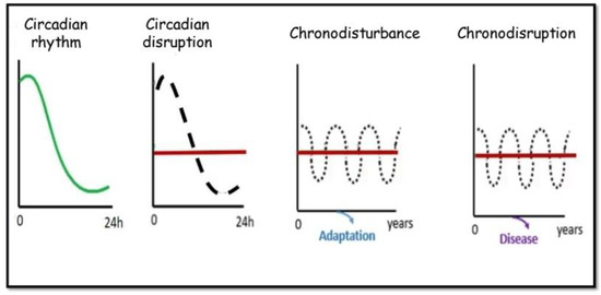 Concepts of circadian disruption, chronodisturbance and chronodisruption. As compared to a normal circadian rhythm, circadian disruptions are characterized by altered circadian rhythm that may be short or long lived. Chronodisturbance is a chronic disruption of circadian rhythms that somehow leads to adaptive phenomena that limit its negative impact. Chronodisruption is a chronic disruption of circadian rhythms that results in disease. Chronodisruptors (not shown) are the factors driving chronodisruption. The normal circadian rhythm is shown as a green line in the left panel and as a discontinuous line in the other panels. A red line represents the altered circadian rhythm in the three left panels. Please note the different timelines shown in the horizontal axis, with chronodisturbance and chronodisruption implying chronicity.