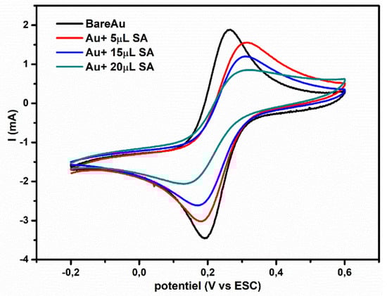 Sodium alginate solutions of different concentrations were prepared. The optimum concentration of the biopolymer was obtained after testing the response of the modified electrode by cyclic voltammetry. We found that the peak current becomes the highest for 0.1 M sodium alginate and the voltammogram shape is well-defined. This concentration was fixed, and three different electrodes with 5, 15, and 20 µL of the biopolymer were tested. When the concentration of sodium alginate is higher, the current decreases (Figure 1). The blocking effect of the deposited layer can be attributed to two reasons: (i) The physical barrier of the biopolymer layer that prevents the access of [Fe(CN)6] 3−/4− to the underlying gold electrode and (ii) the electrostatic repulsion charge–charge between the surface COO− groups of the sodium alginate and the redox couple. Thus, 15 µL was chosen as the optimum volume of sodium alginate for the modified gold electrode.