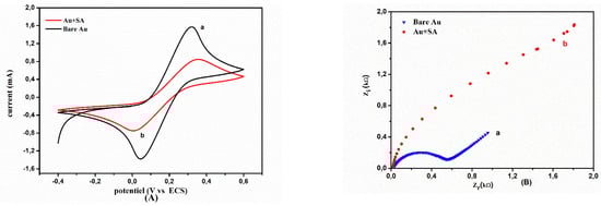 (A) Cyclic voltammetry at a scan rate of 100 mVs−1, (B) Nyquist diagrams obtained in a frequency range of 100 MHz–100 kHz, in the presence of 5 mM Fe(CN6)3−/4− 20 mM phosphate buffer, pH 7.0 at open circuit potential of 200 mV (a) bare gold, (b) gold modified by sodium alginate.