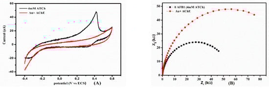 (A) The cyclic voltammograms obtained in phosphate buffer saline (PBS) (B) Nyquist plots after adding a concentration of 4 mM of ATCh in the solution of PBS (0.1 M).