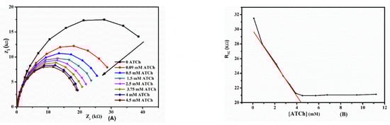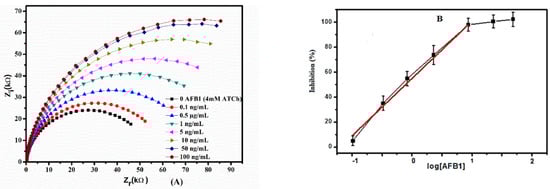 The biosensor signal associated with the introduction of 4 mM acetylthiocholine through the experimental cell was determined, and its value was established as 100%. Subsequently, the aflatoxin B1 solution, whose concentration is to be determined, was added to the measurement cell [29]. The diameter of the Nyquist circle was found to increase with the addition of AFB1 (Figure 6A), indicating a rise in RCT. Using the Zplot/Zview software, the value of RCT was designed for each AFB1 concentration by fitting the experimental data.
