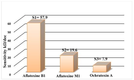 The choice of the proposed impedimetric biosensor for detecting more groups of toxicants was also investigated. Figure 7 illustrates the experimental results of the established AChE-modified biosensor to AFB1, ochratoxin A (OTA), and aflatoxin M1. The biosensor signal was repressed by all groups of toxicants to varying extents. The highest sensitivity was achieved for aflatoxin B1 (57.9 kΩ/dec).