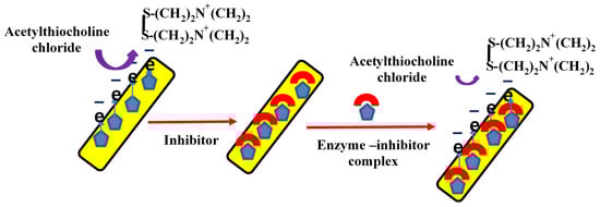 If the inhibitor is not present in the system, ATCh would be transformed into thiocholine and acetic acid, as presented in Equation (1) If the inhibitor exists in the test solution, the concentration of thiocholine is completely diminished, i.e., thiocholine and acetic acid are not formed; in other words, it absolutely inhibits the conversion, as presented in Scheme 1. Under the influence of applied voltage, thiocholine is oxidized. The anodic oxidation current is inversely proportional to the concentration of toxic complexes in the sample and the time of contact.