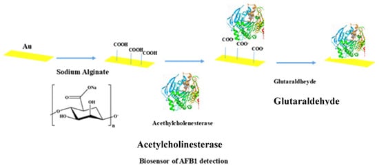 Based on the above discussion, in this study, we developed a novel gold electrode modified with sodium alginate for the immobilization of AChE. An impedimetric biosensor to detect AFB1 was therefore obtained in the presence of the AChE substrate, acetylthiocholine (ATCh).