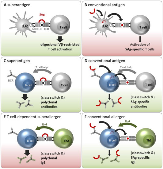 SAgs interact with immune cells in various ways, leading to oligoclonal or antigen-specific activation of T and B cells. (A) SAgs cross-link APCs and T cells regardless of the specificity of the TCR, leading to a Vβ-restricted, oligoclonal T cell activation. (B) SAgs can be taken up and processed by APCs and subsequently presented as conventional antigens on MHC-II molecules to T cells. T cells whose TCRs are specific for the SAg can bind the MHC:peptide complex and become activated. (C) In this special case of SAg-induced immune cell activation, B cells act as APCs. By cross-linking, T cells are activated in a Vβ-restricted manner, as described in A. Moreover, the cross-linked B cells receive activation signals regardless of their B cell receptor (BCR) specificity. This results in the polyclonal B cell activation and the production of polyclonal antibodies. (D) SAg-specific B cells bind SAgs via their BCR, followed by processing and subsequent presentation to T cells as conventional antigens on MHC-II molecules. The activated SAg-specific T cells will provide T cell help to the presenting B cells, resulting in B cell activation, plasma cell differentiation, and the release of specific antibodies against the encountered SAg. (E) If SAgs cross-link B cells with Th2 cells, the latter are activated in a Vβ-restricted manner and release type 2 cytokines (e.g., interleukin 4 (IL-4)). IL-4 can induce a class switch to immunoglobulin E (IgE) in the cross-linked B cells, resulting in the production of polyclonal IgE. To designate this hitherto unrecognized feature of SAgs, we propose the term ‘T cell-dependent superallergen’. (F) SAgs can also act as conventional allergens. In this scenario, SAg-specific B cells bind SAg via their BCR followed by processing and subsequent presentation as conventional antigens on MHC-II molecules to Th2 cells. The activated SAg-specific Th2 cell will provide B cell help and release IL-4, which induces class switch to IgE and the production of specific antibodies against the encountered SAg. Green background color: There is strong scientific evidence for interaction. Red: There is currently only limited evidence for this interaction. Arrows indicate sequence of events.