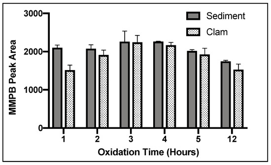 MMPB yield from MC-LR spiked blank sediment and clam tissue matrices when exposed to 0.1 M oxidation solution for 1, 2, 3, 4, 5, and 12 h. Each bar represents an average of three samples. Error bars are standard deviations.