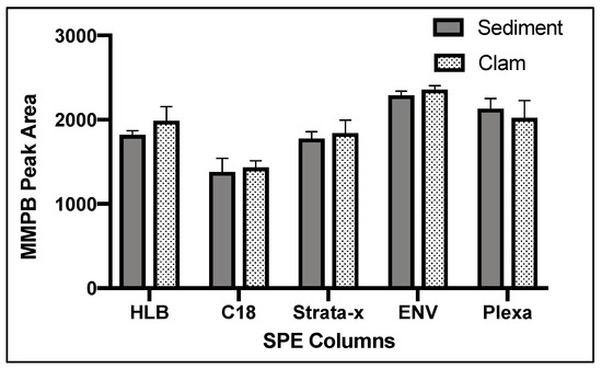 MMPB yield from MC-LR spiked sediment and clam tissue matrices testing five different Solid-Phase Extraction (SPE) columns. Each bar represents an average of three samples. Error bars are standard deviations.